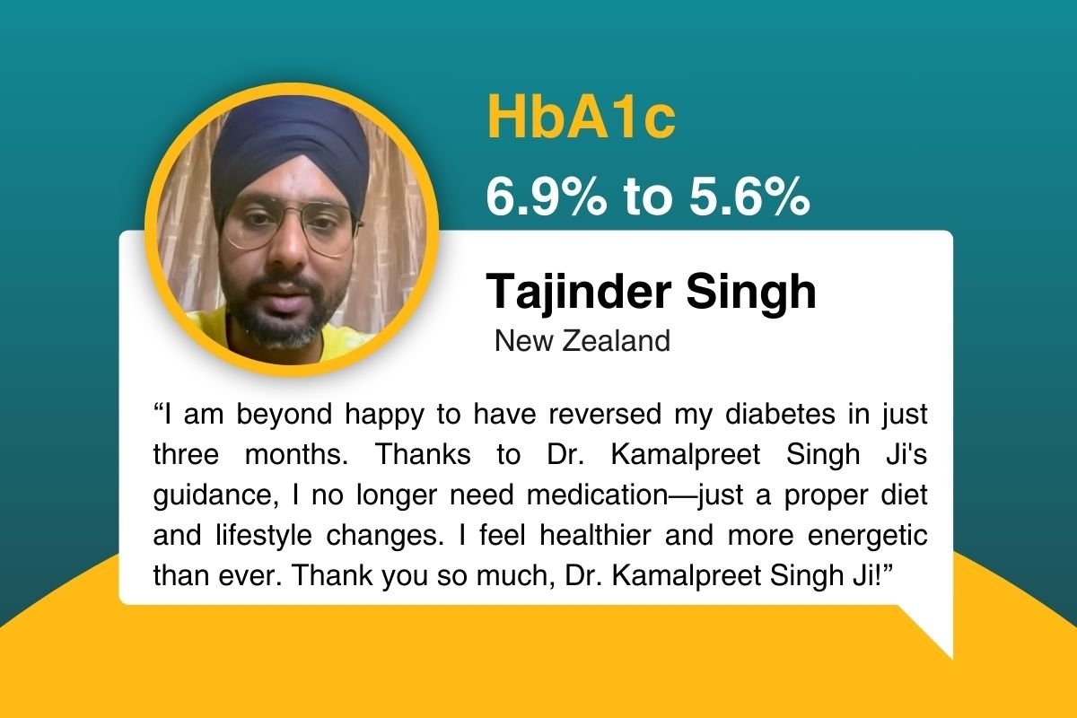 Dr. Kamalpreet Singh provided Harjinder with a personalized diet plan aimed at naturally reducing his blood sugar levels. Committed to following the regimen, Harjinder noticed significant improvements within just three months. His HbA1c levels dropped to a remarkable 5.9%, and his blood sugar levels returned to the normal range.